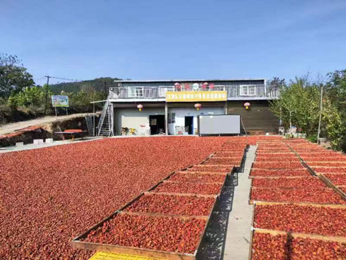 离开热火朝天的青木林园区,记者又前往东茂山楂园,甫一进院落,晾晒场上的切片山楂便铺满了视野,园区负责人王道东和妻子徐尤娣领着工人们将山楂片仔细翻晒,空气中弥漫着诱人的甜香。“我们种山楂10来年了,今年天气好,山楂又大又红,总共收了大概有100多吨,大部分都被药材商、加工山楂酒的拉走了,现在清园后剩了5吨,我们就准备加工成山楂片、山楂果脯,销路一点都不愁。”朗朗笑声中,王道东指着已经罐装、塑封好的山楂系列产品,眼里是掩不住的自豪。