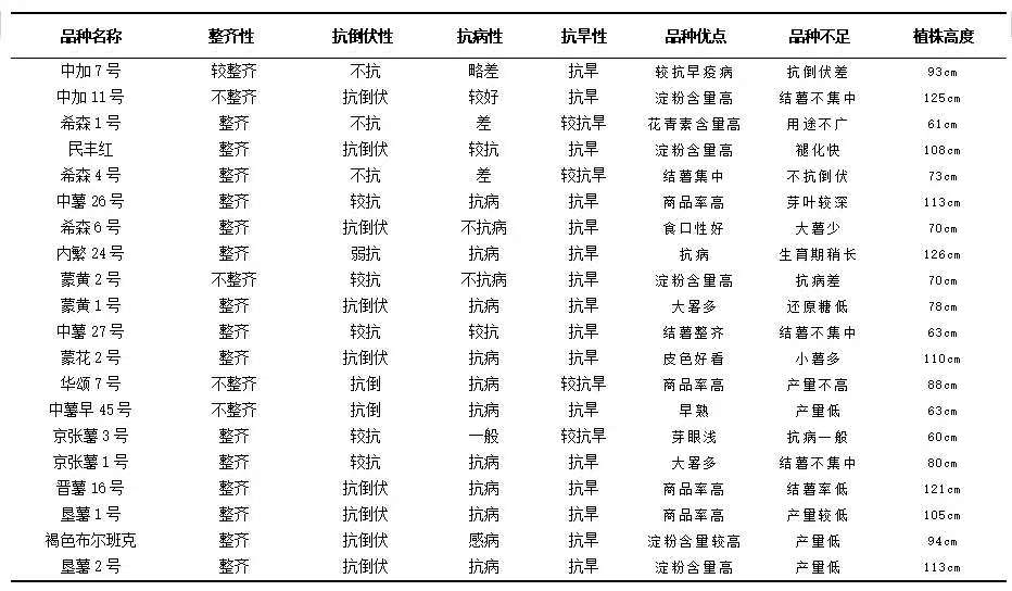 中加7号、中加11号、希森1号、民丰红、中薯26号、希森6号、内繁24号、蒙黄2号、蒙黄1号、中薯27号、蒙花2号、华颂7号、中薯早45号、京张薯3号、京张薯1号、晋薯16号、垦薯1号、褐色布尔班克、垦薯2号、希森4号共20个不同类型马铃薯。