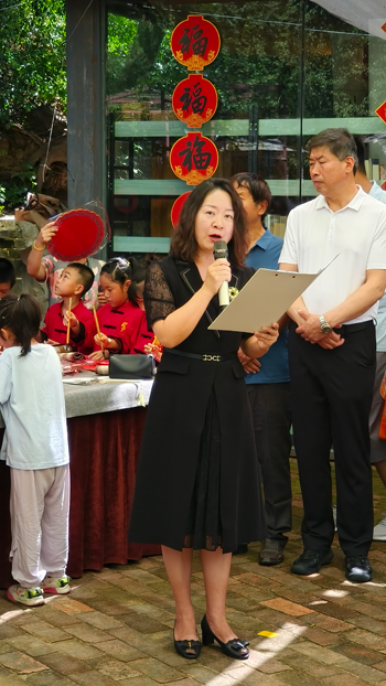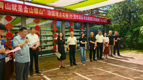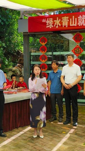 房山区文联党委书记郝金英则从“两山”理念角度,强调艺术创作当为时代立传、为山河代言,她深情地说:“2005年,习总书记提出的‘绿水青山就是金山银山’理念已经成为全党全社会的共识和行动,成为新发展理念的重要组成部分,也被国际社会高度认可,今天,艺术家们用饱满的热情和精湛的技艺,将‘两山’理念的哲思、对壮美山河的热爱、对绿色发展的期盼,倾注于尺素之间,就是要通过书法的形式倡导大众成为优美环境的‘受益者’,争做美丽家园的‘建设者’,牢记山清水秀‘金不换’,捧牢生态资源‘金饭碗’,用好绿色发展‘金钥匙’。今天的展览,不仅是书法艺术的盛宴,更是生态成果的文化表达。”最后,她倡议广大文艺工作者和爱好者,要以友好互助的奉献精神,不忘初心的奋斗精神,保护生态的担当精神,深入学习贯彻落实习近平生态文明思想,用手中的笔,凝聚大众环保力量,倡导全民低碳生活,描绘更美的‘绿水青山’,换来成色更足的‘金山银山’,为生态文明立心、为绿色发展立行、为乡村振兴立言、为志愿奉献立德。