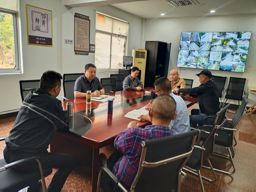 东山村党支部书记、村委会主任徐佩伦(左二)部署下一阶段重点工程