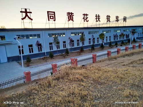 大同花倾城田间农业发展有限公司,又名大同黄花扶贫车间,坐落于山西省大同市云州区下榆涧村,是一座真正的田间地头扶贫工厂。工厂占地面积5万多平,建有大型加工生产车间6000㎡,冷库1000㎡,晾晒大棚1万㎡;工厂拥有全国领先的黄花菜全自动生产化流水线2条,日加工鲜黄花菜40吨。