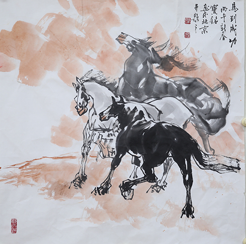 多年画马,他总结出一套独特技法:若无线条,马便无风骨:若线条过多,墨色则不够丰富,需做到千篇一律却又不失变化。在他的笔下,线条犹如灵动的音符,跳跃在画面之上,勾勒出马的轮廓;墨色则如同绚丽的色彩,渲染出马的神韵。他巧妙地运用线条与墨色的变化,使每一匹马都栩栩如生,仿佛具有了生命。